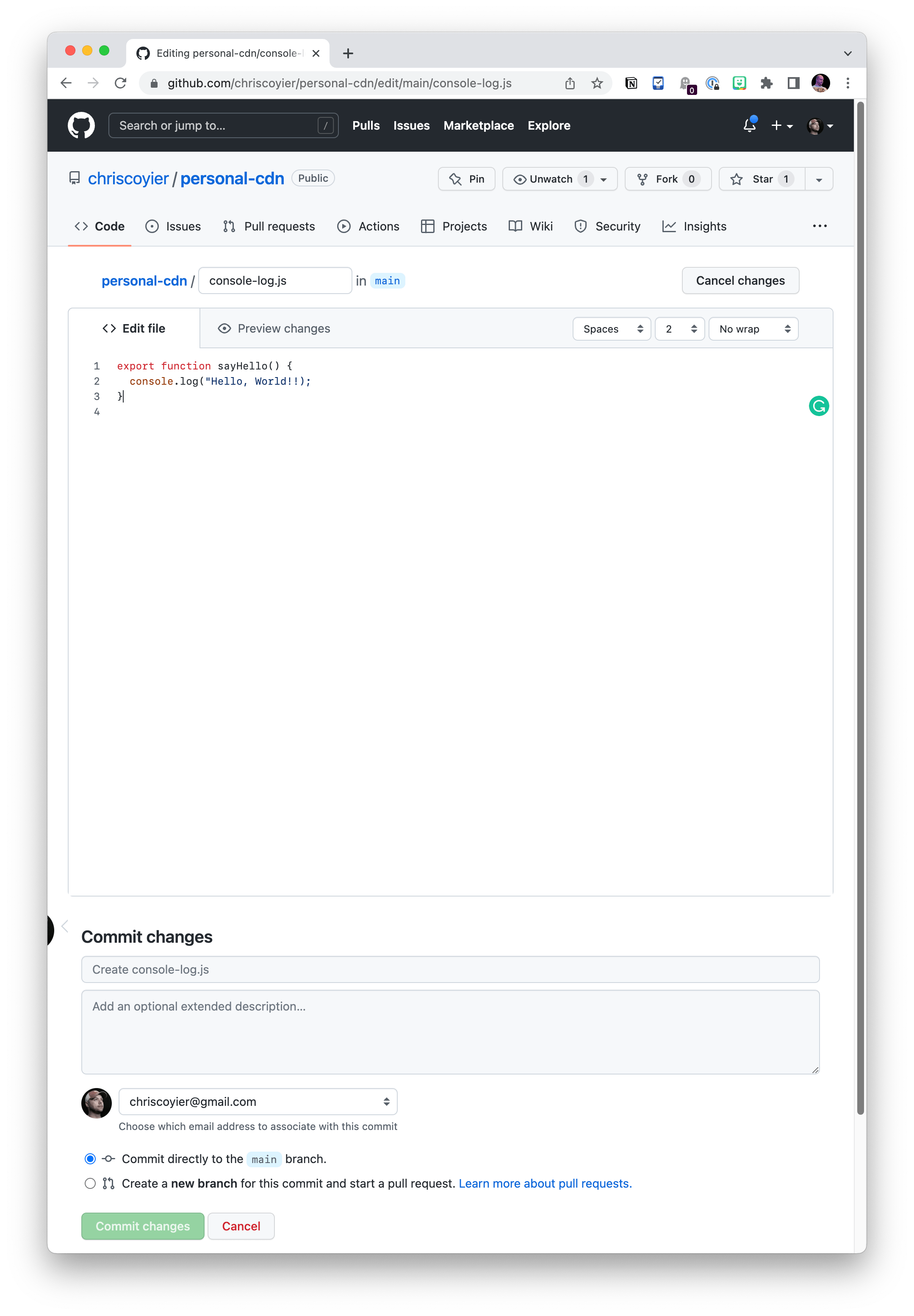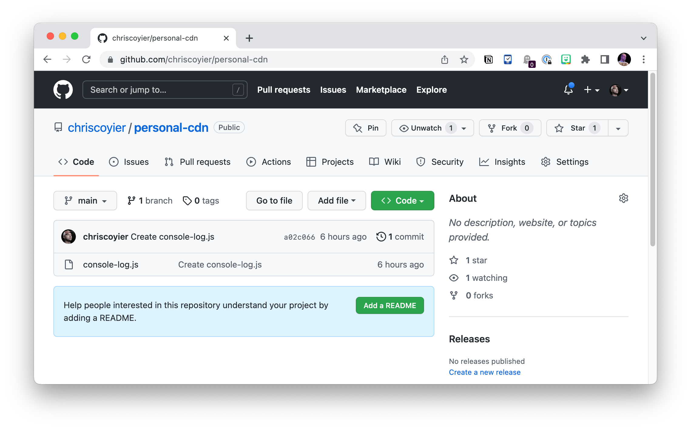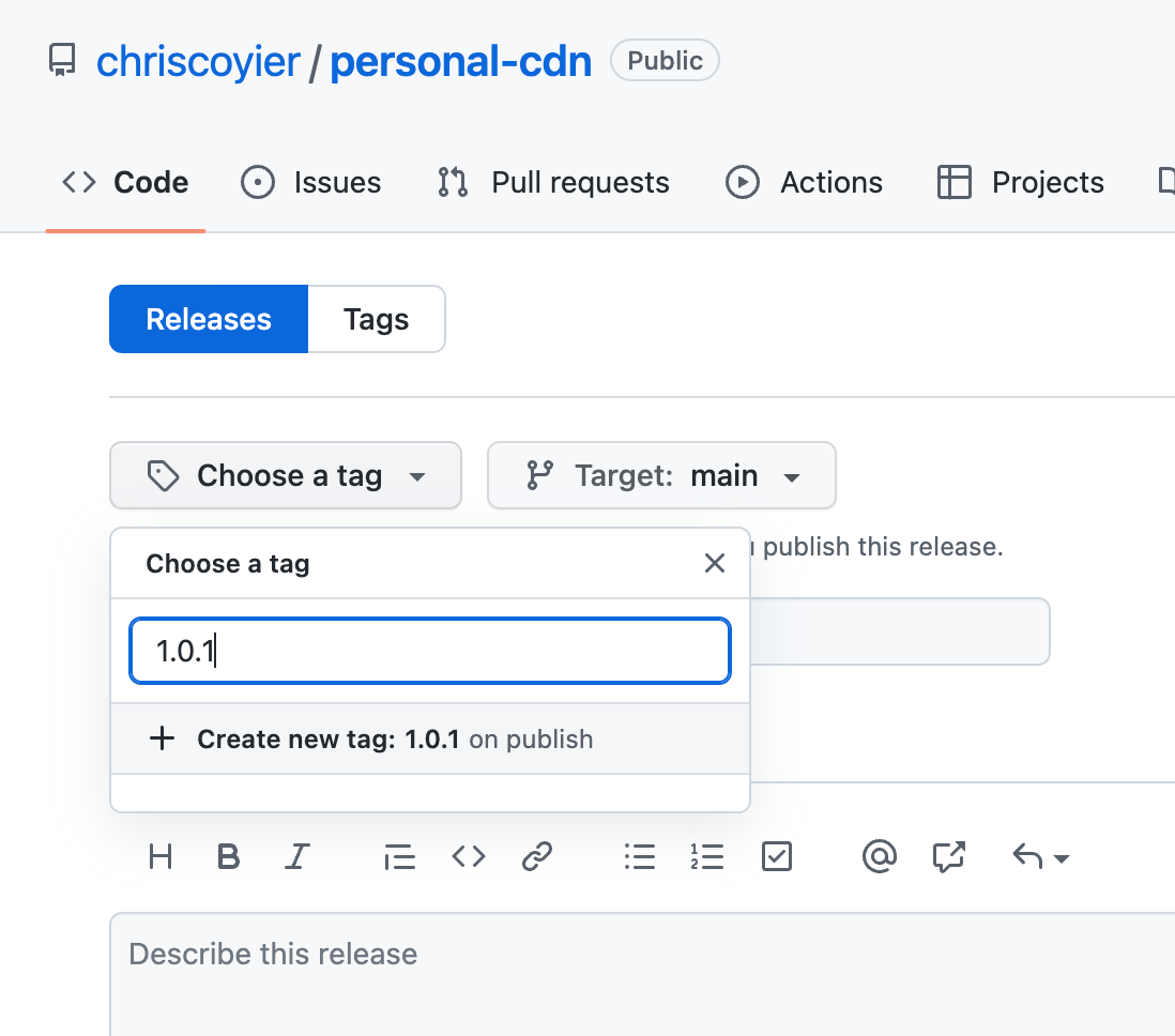 https://cdn.jsdelivr.net/gh/chriscoyier/personal-cdn<strong>@1.0.0</strong>/console-log.js https://cdn.jsdelivr.net/gh/chriscoyier/personal-cdn<strong>@latest</strong>/console-log.jsCode language: HTML, XML (xml)That’s easy enough to do right on GitHub.com as well: